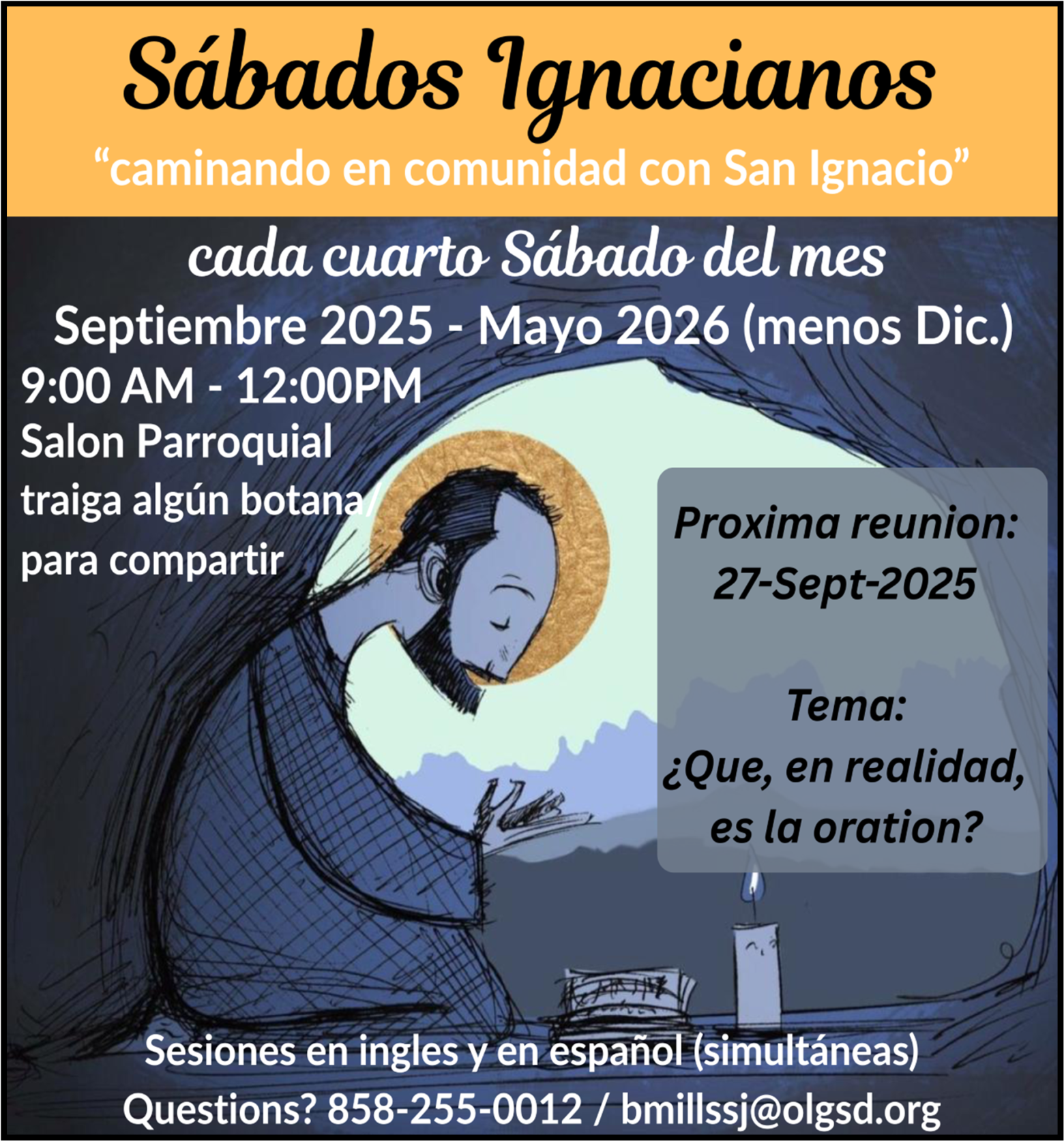 Ven a la Parroquia de Nuestra Señora de Guadalupe para los "Sábados Ignacianos", cada cuarto sábado del mes (de septiembre de 2025 a mayo de 2026, excepto en diciembre), de 9am a 12pm en el salón parroquial.
