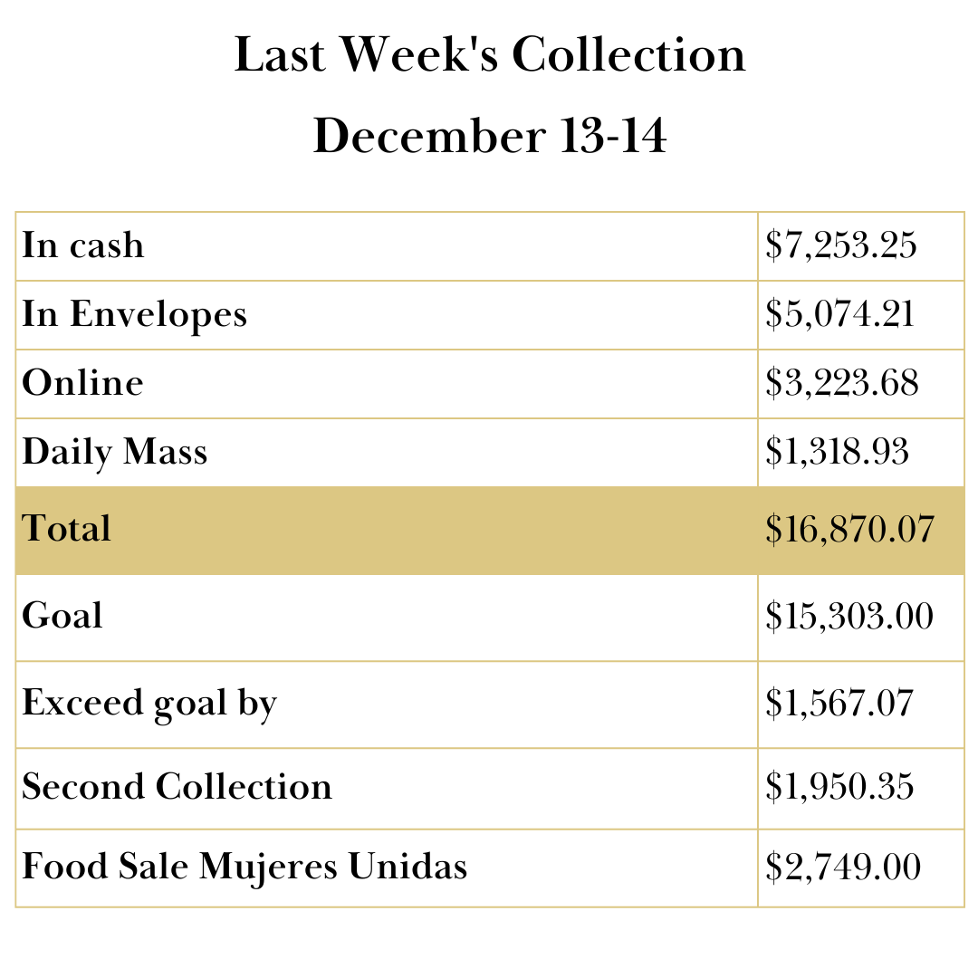 A great sign of our trust was how many people came to celebration Our Lady of Guadalupe last week. It was so joyful, so encouraging! I want to thank you all for coming to celebrate with us. I especially want to thank Adiel and Yolanda Morales who led the food sales and helped make it all so joyful. In January we will give a full report. But for now, let me thank them and you all. We continue our Advent wait in hope, because God is with us.
