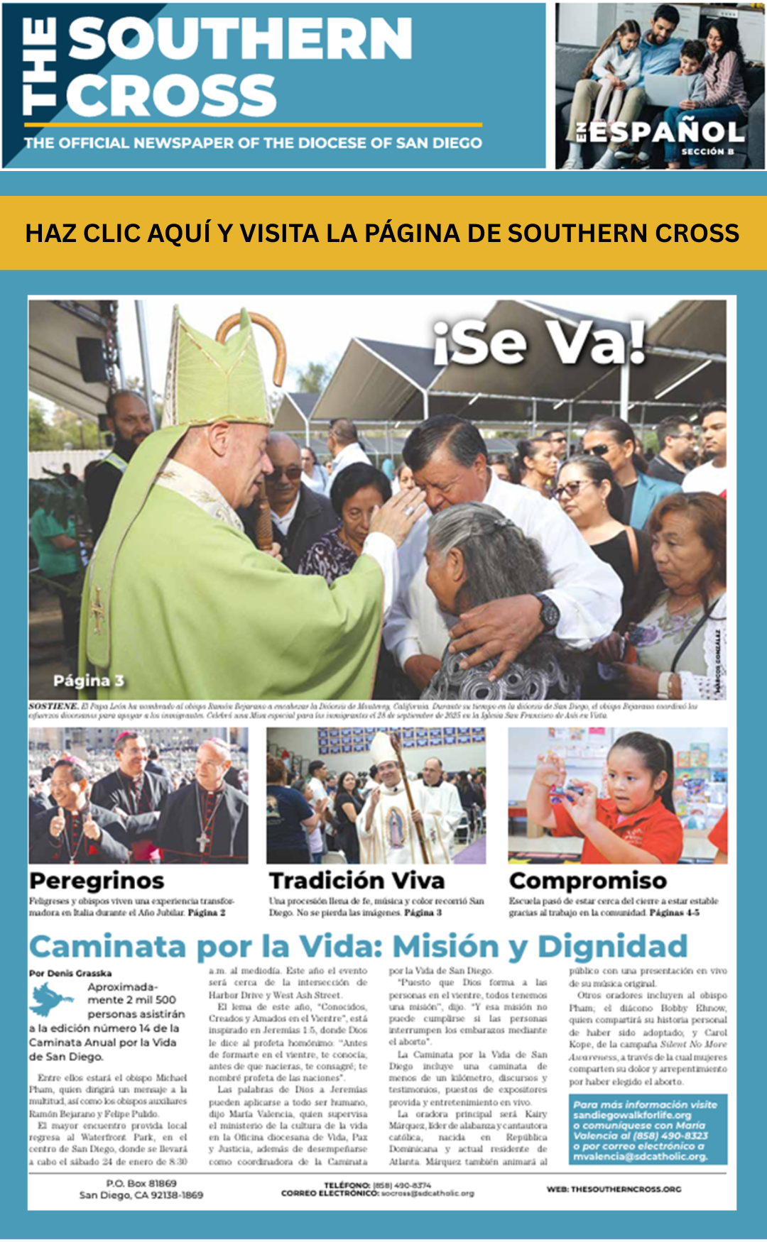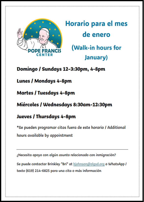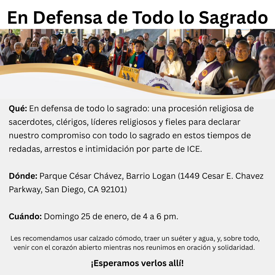 Este domingo también caminaremos juntos en una procesión por nuestro vecindario. Se titula «En Defensa de todo lo sagrado». Comenzaremos en el Parque César Chávez a las 4 p. m. y caminaremos en procesión —sacerdotes, líderes religiosos, diáconos, fieles de nuestra parroquia y de otras iglesias de San Diego— reclamando lo sagrado de nuestro vecindario. Terminaremos en la Parroquia de Nuestra Señora de Guadalupe a las 5 p. m., donde nuestros líderes religiosos firmarán una declaración profética, afirmando que nosotros, como personas de fe, no entregamos la dignidad de nuestra comunidad ni de nuestros vecindarios a las acciones deshumanizadoras de las redadas o arrestos de ICE. Esto será nuestra elección de caminar en la luz, la luz que nos brinda nuestra fe en Dios, la luz que surge cuando recordamos que no estamos solos, que surge cuando recordamos que NOSOTROS PERTENECEMOS.