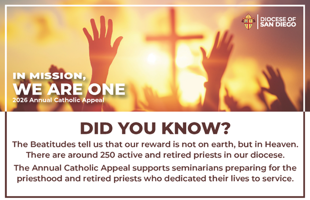 This weekend “humility” is the word of the day in the readings. We hear some form of it three times in the first reading, and in the second reading and gospel we hear similar terms. It is who we are called to be. “Humility” comes from “humus” or the “ground, the earth, the soil.” We are called to be connected with the ground, to be rooted. Our church, our parish is a grounded, rooted, humble church. If we look at our location, we are in a part of San Diego that is humble, noisy, right alongside the ever-moving Interstate 5 freeway. Our building itself is simple. It is not adorned with gold or marble. And there are signs of age and wear, of course.
