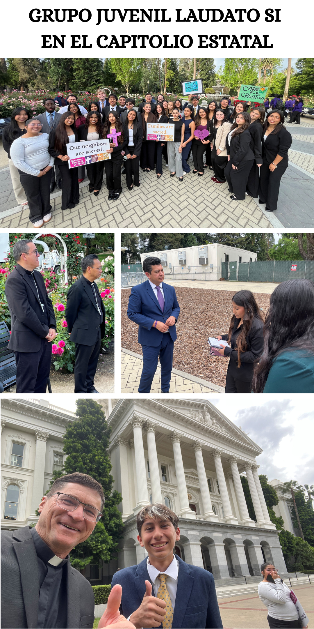 La semana pasada, nuestro increíble grupo juvenil Laudato Si, acompañado por nuestro párroco, el padre Scott Santarosa y los líderes de nuestro grupo, Rosy y Maricruz, hicieron un viaje al capitolio estatal en Sacramento para participar en la cumbre de defensa con la Provincia de Jesuits West y varias otras escuelas católicas y parrocas de todo el estado. Nuestros jóvenes trabajadores se habían estado preparando durante meses para tener las palabras adecuadas para defender a nuestros hermanos y hermanas en nuestra comunidad sobre cuestiones que les afectan personalmente, con respecto a políticas de inmigración injustas, injusticias ecológicas y la crisis de la vivienda. Se dedicaron a crear y planificar sus reuniones con los legisladores preparando y practicando sus funciones, asegurando que sus puntos fueran recibidos y escuchados adecuadamente. Tuvieron la oportunidad de reunirse personalmente con los miembros de la asamblea David Álvarez y Jeff González para presentar y obtener su apoyo sobre varias propuestas. Entre ellas, los proyectos de ley que abogan por la tributación sobre las instalaciones de detención que retienen a los inmigrantes que han sido detenidos, haciéndolos económicamente inviables para correr en California, y la defensa de un proyecto de ley que presiona para la restauración de los beneficios de MediCal para los inmigrantes después de que el Gobierno Federal los hubiera recortado. Además, presentaron proyectos de ley sobre la preservación de nuestras tierras federales para que no se vendan o para evitar que pierdan sus protecciones ambientales.